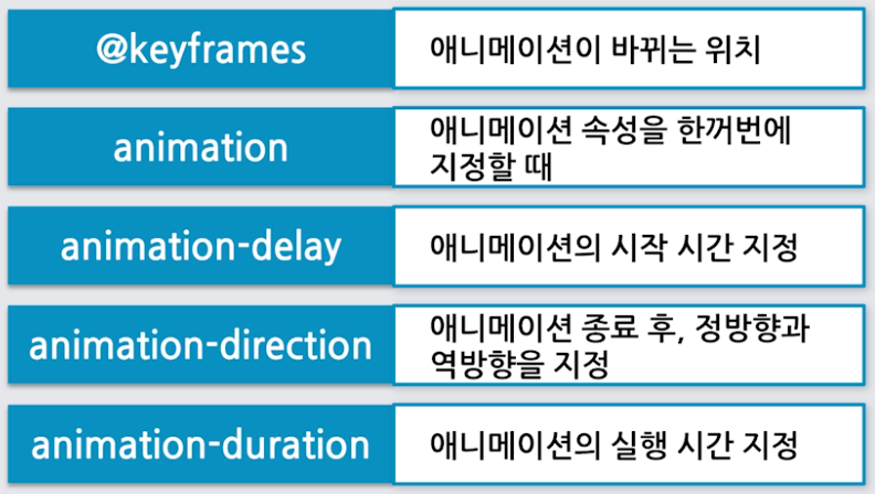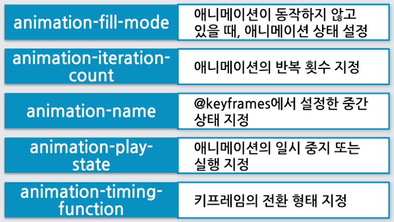 애니메이션(animation) : 애니메이션이 바뀌는 위치, 속성, 시작 밑 종료 시간, 방향, 횟수 등