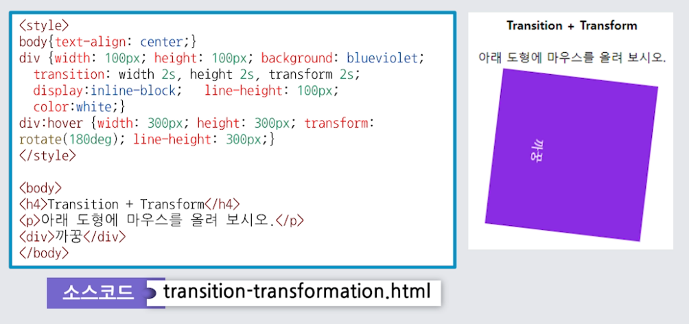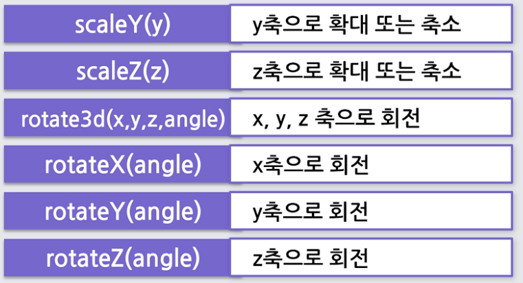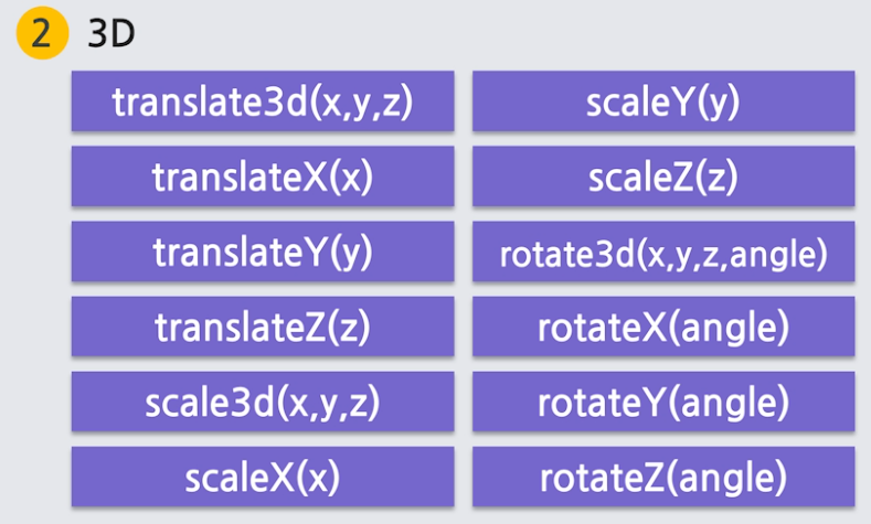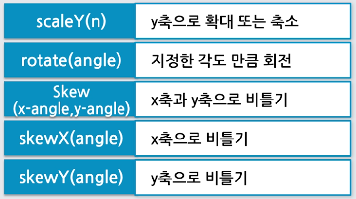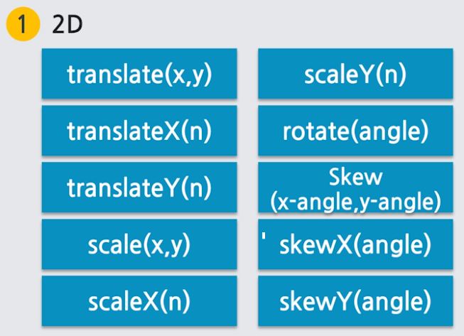 변형(transform) : x축과 y축으로 이동, 확대, 축소 회전 등 설정 가능